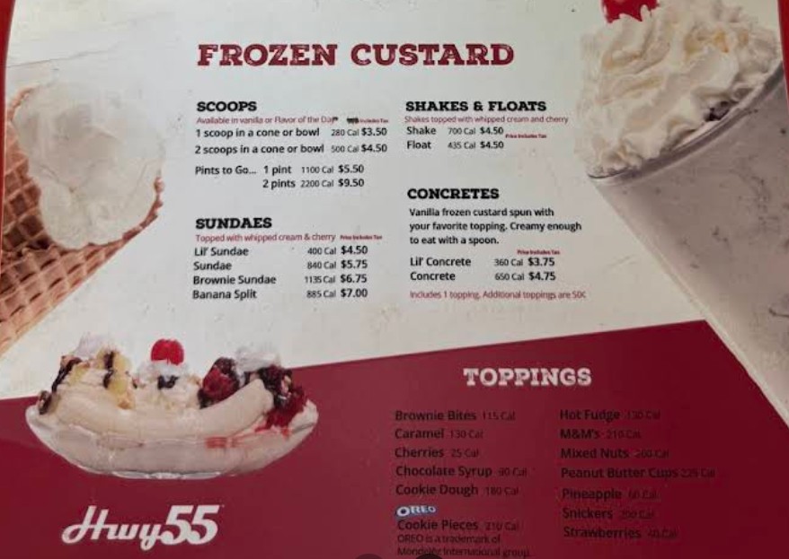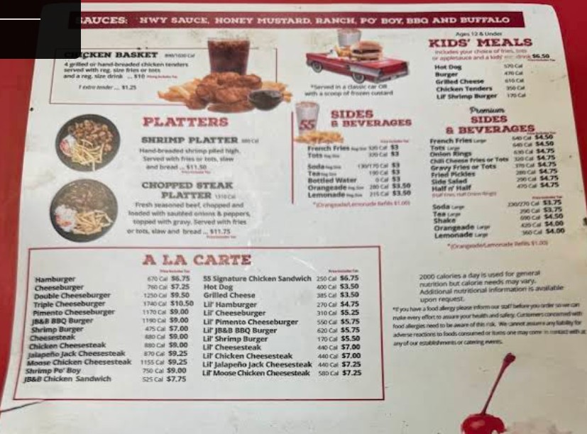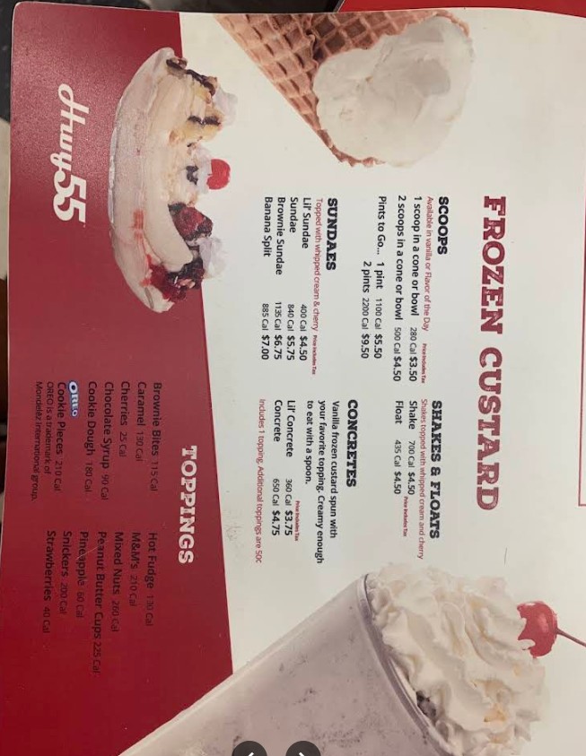 Good food. I’ve had it all, it’s all good no matter what you get. My favorite is the chicken strip platter. Slaw, fries, buttery toast and you can get 4 or 6 chicken strips. The burgers are good. Shrimps good. Coleslaw is really good. They have sweet tea, Pepsi products, their orangeaid is really good. Fresh squeezed oranges mixed with a sugar water. They have frozen custard. You can get it plain or toppings added. They have really good banana splits. Go after 5pm, the staff is better and a lot nicer.